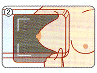 撮影用の装置で乳房を挟みながら圧迫し、片方ずつ撮影します。標準の撮影では、上下方向から1枚、斜めから1枚を撮影しますが、50歳以上の方を対象とした検査などでは、ななめ方向だけ撮影する場合もあります。撮影は、1人あたり10~15分程度で終了します。